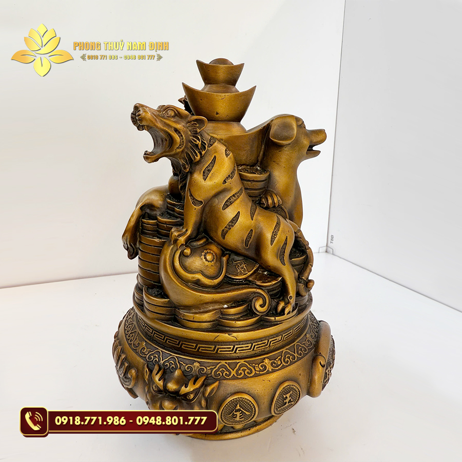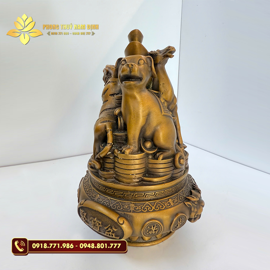 Mỗi linh vật được thể hiện với đường nét sống động: hổ dữ dội, ngựa mạnh mẽ, chó trung thành. Sự kết hợp tinh tế giữa ba dáng đứng vững vàng trên bệ đồng tạo cảm giác cân đối và hài hòa cho tổng thể.